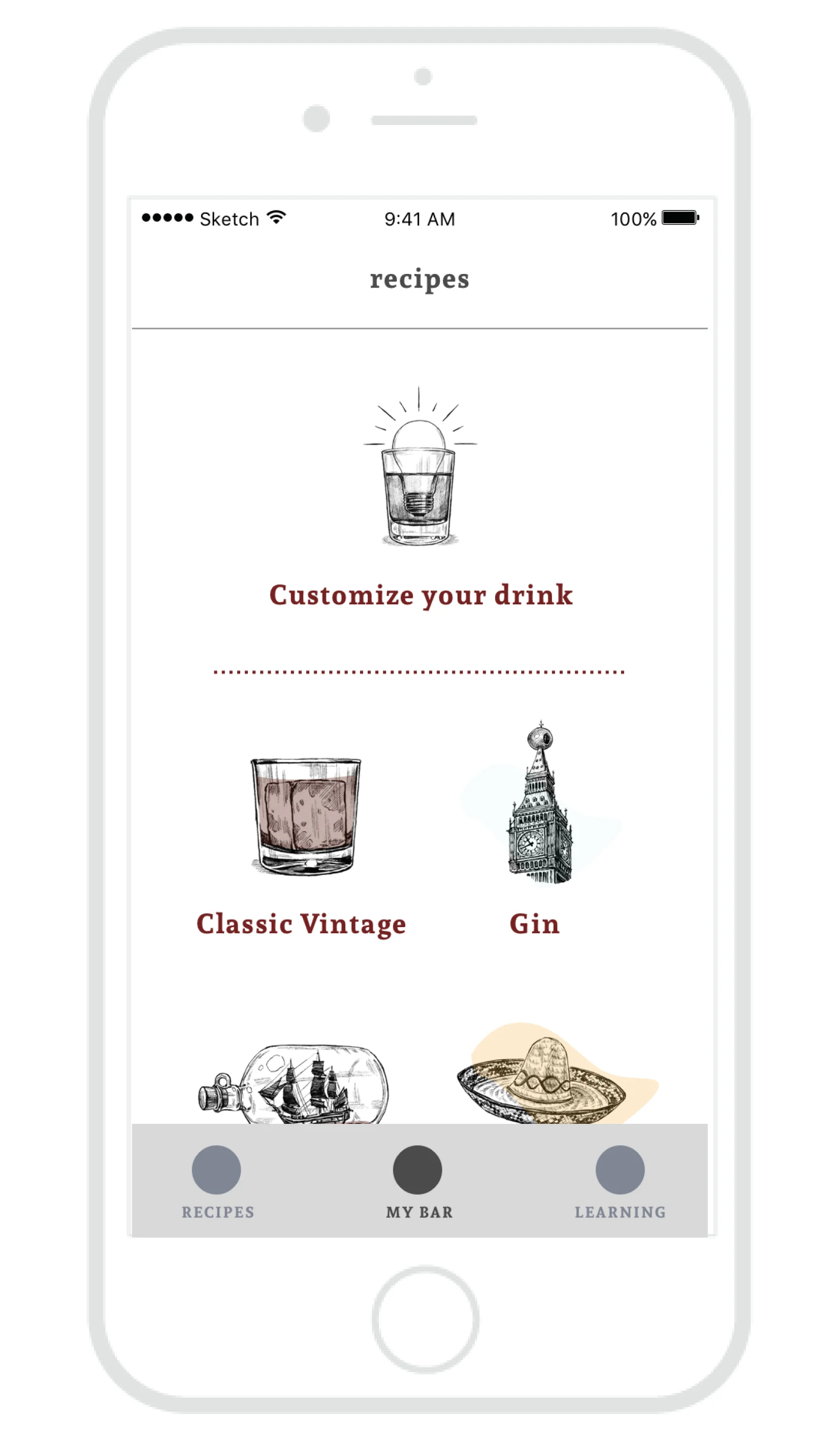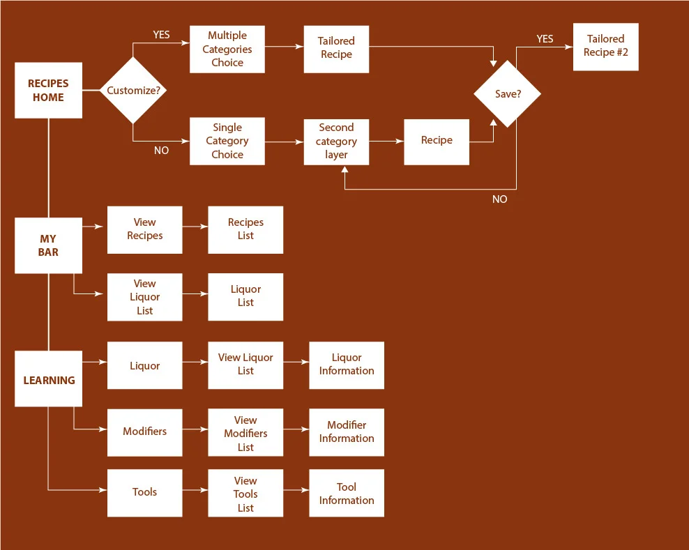 - Recipes Home: Placed as the home screen, the user can explore different recipes by either choosing to customize his/her drink or to choose from one of the single liquor categories.