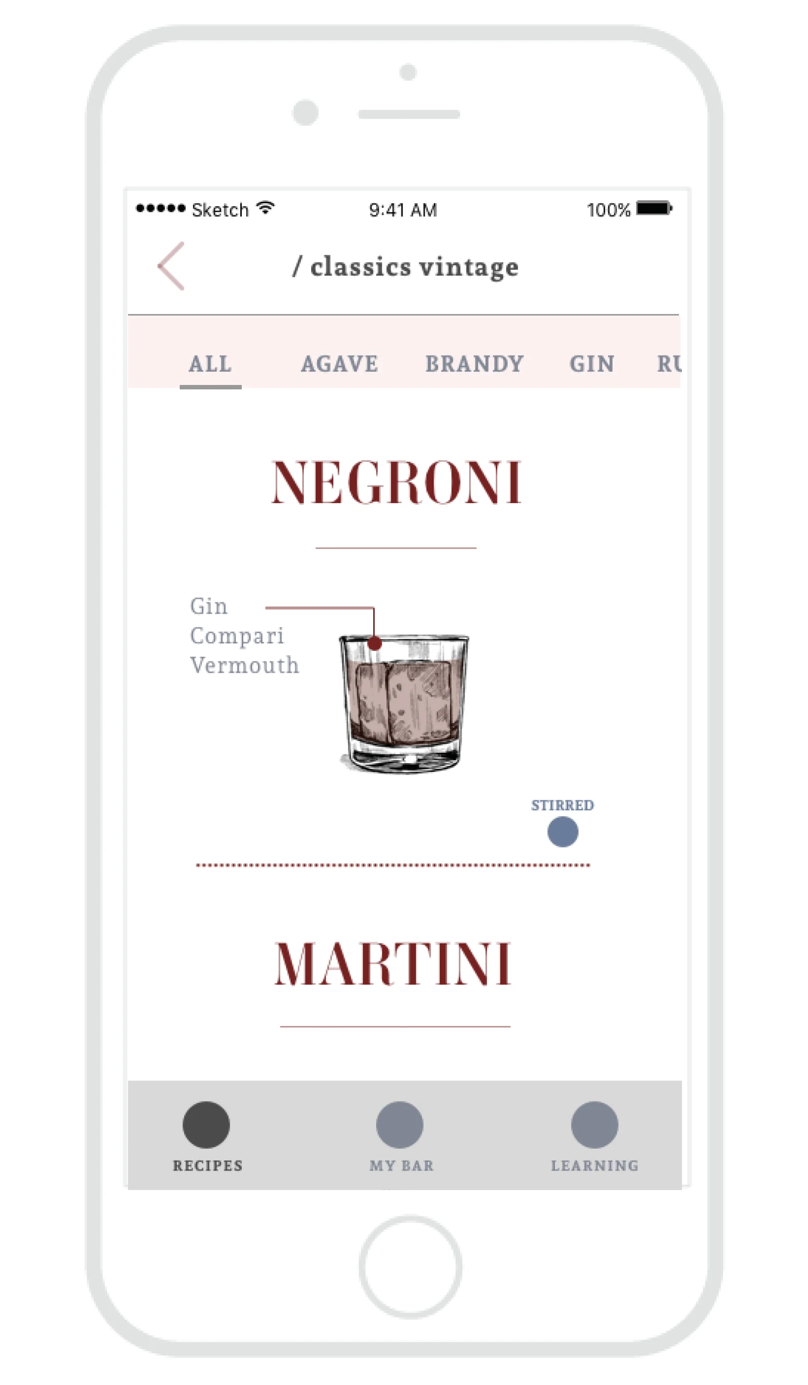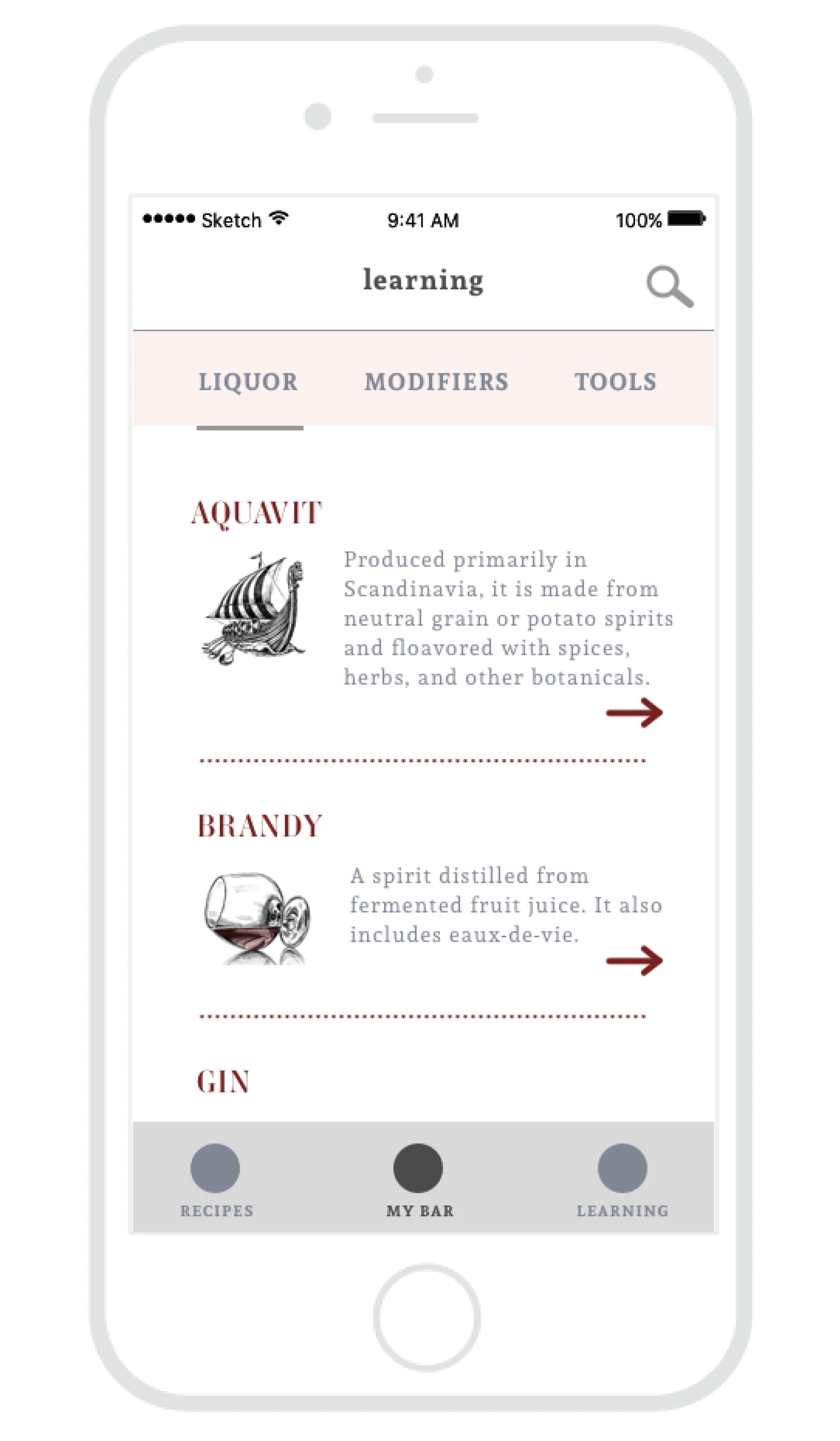 - Learning: The learning section is currently divided into 3 parts - liquor, modifiers, and bar tools - and allows users to learn about each on the fly.