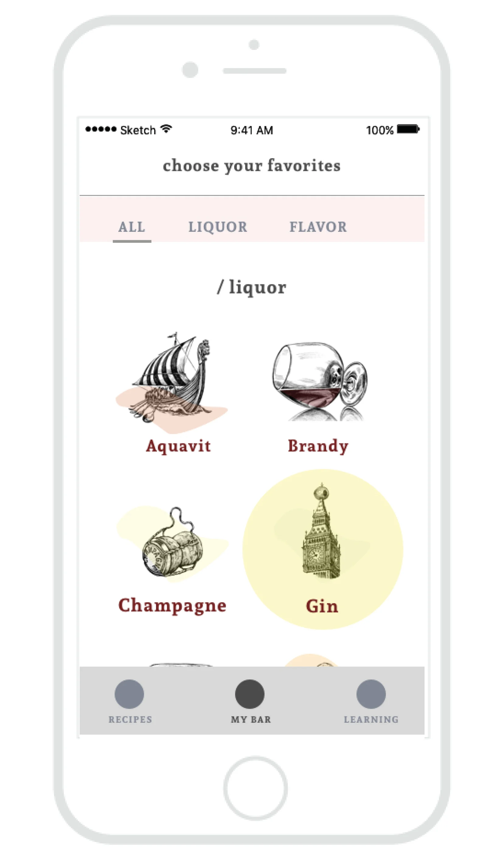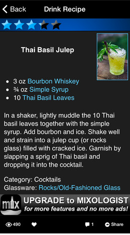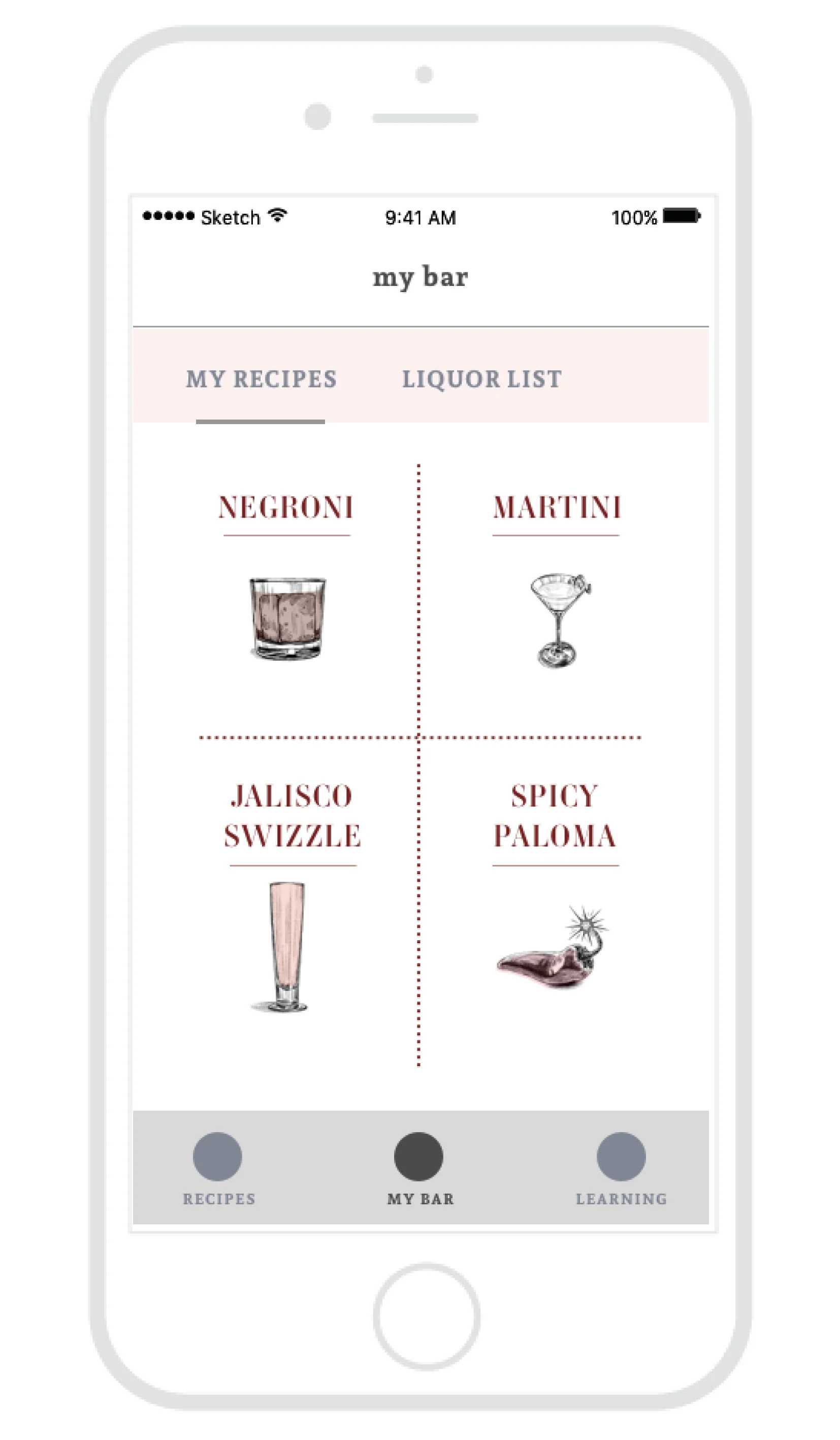 A cocktail mobile app designed for both novices and connoisseurs to learn and experiment with liquor and recipes.