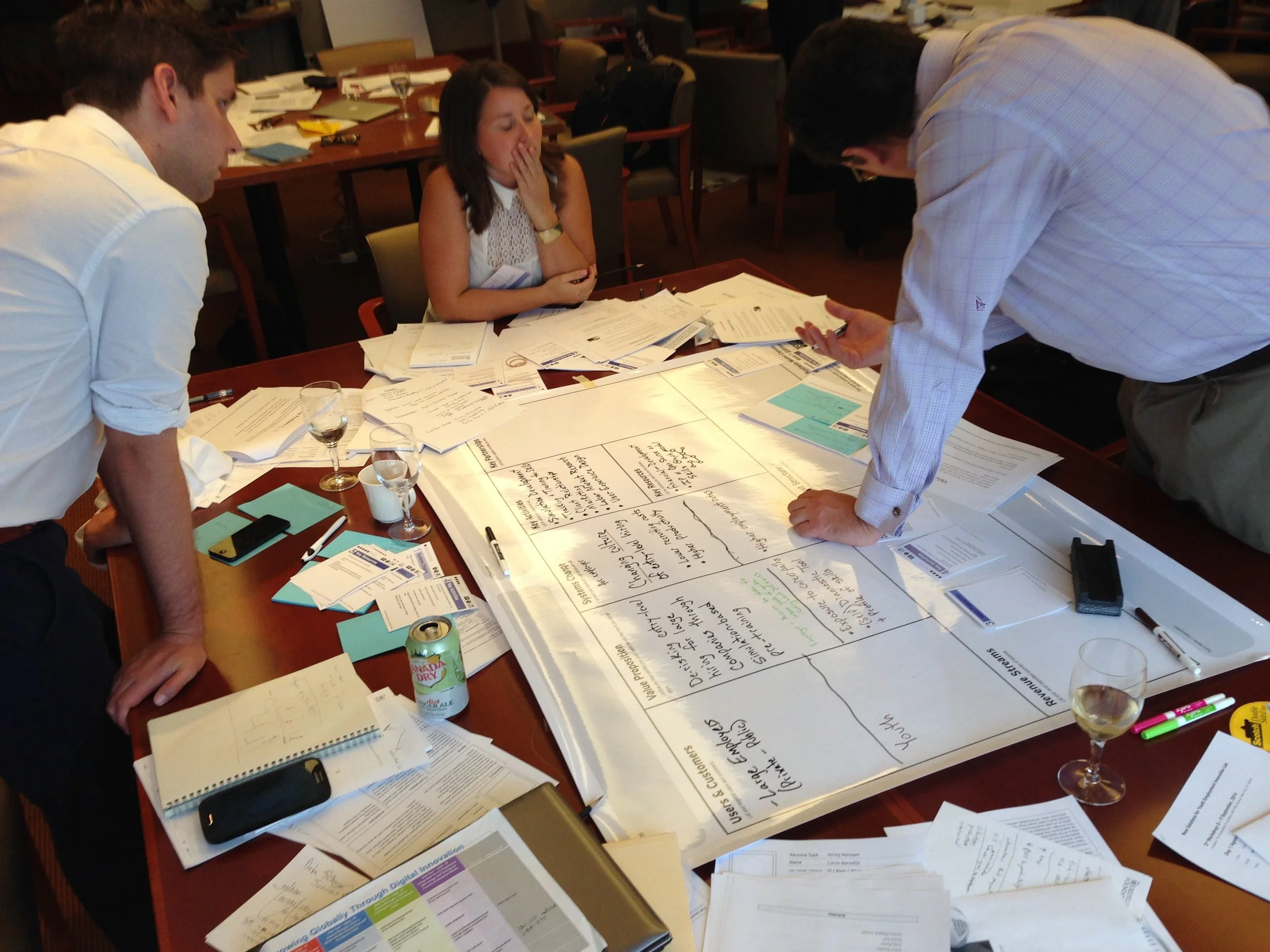 In preparation for the series of workshop, we re-designed the well-known Business Model Canvas to include 'Systems Impact' to stress our collective desired outcomes. We chose to use a large poster-format to support team collaboration. However, we have later discovered that in certain settings, printing them as a page-by-page exercise can be more effective if the exercise is short or the audience is not as familiar with the tool. The tool was so well-liked that participants asked if they could buy prints from us.